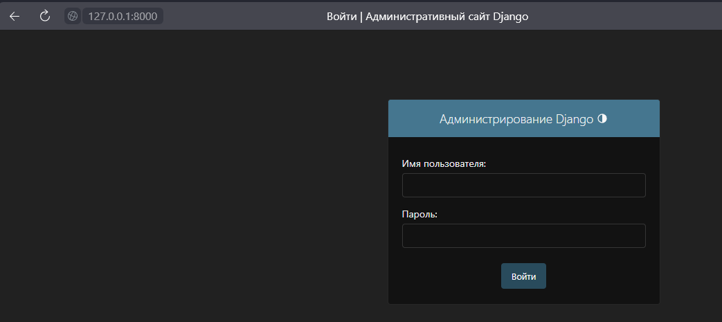 Если перейти по адресу http://127.0.0.1:8000/admin/, мы попадём на страницу авторизации в панель администратора Django.
